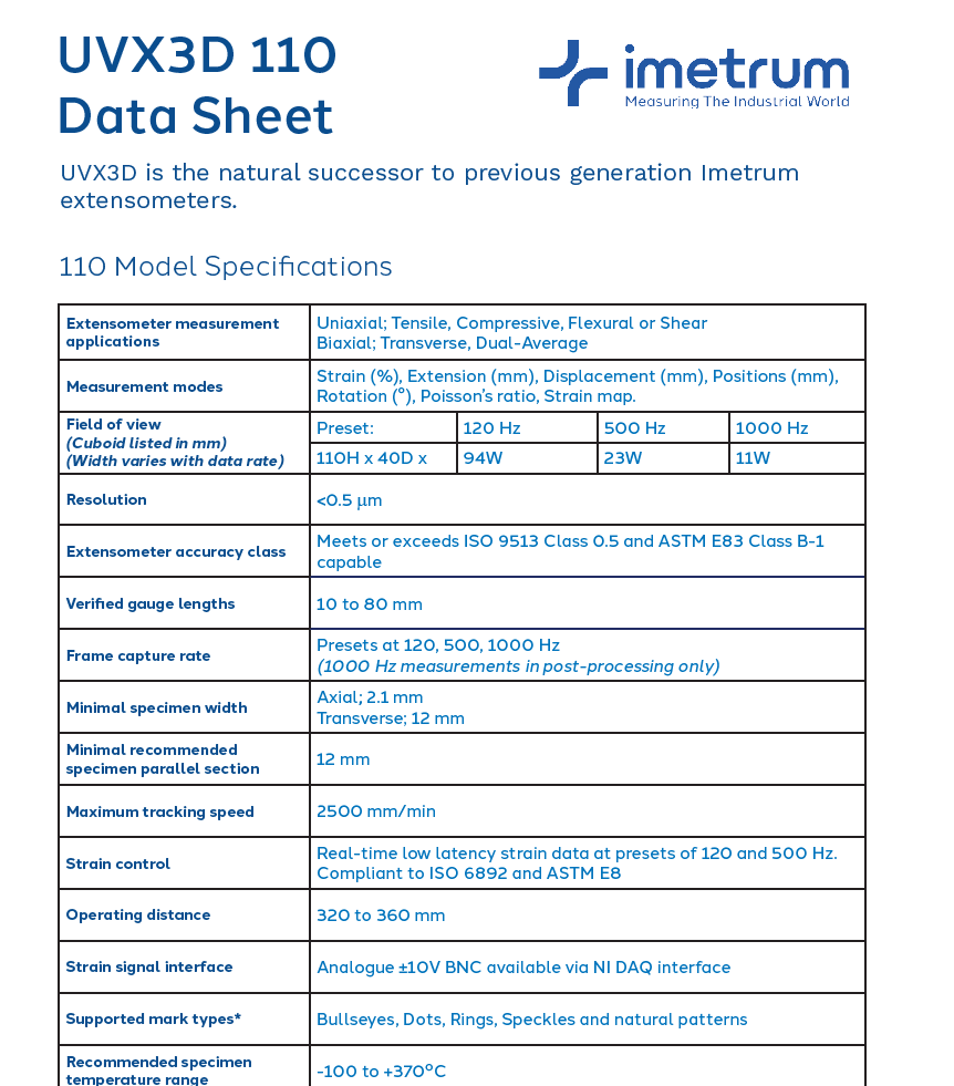 UVX3D 110 data sheet Specification for UVX3D 110 dynamic extensometer. Preview: DS1167_v4- UVX3D 110 datasheet.pdf (177 KB) Created On: Thu, 22 May, 2025 at 9:46 AM Last Modified: Fri, 24 Oct, 2025 at 3:13 PM Facebook Twitter LinkedIn